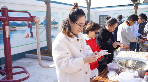 上午9時,黨員們來到勝鹽村后就各司其職,奔赴在各個“崗位”上開始忙碌起來,洗菜切菜、量血壓、理發、唱越劇、包餃子,現場充滿著溫馨和諧的氣氛。