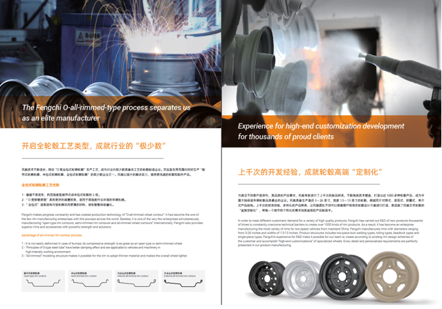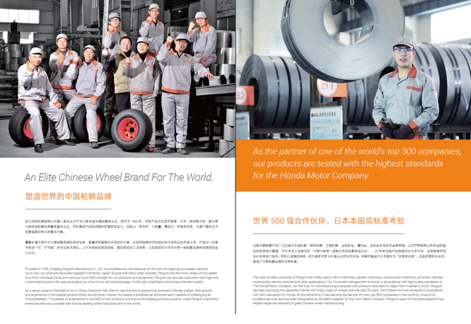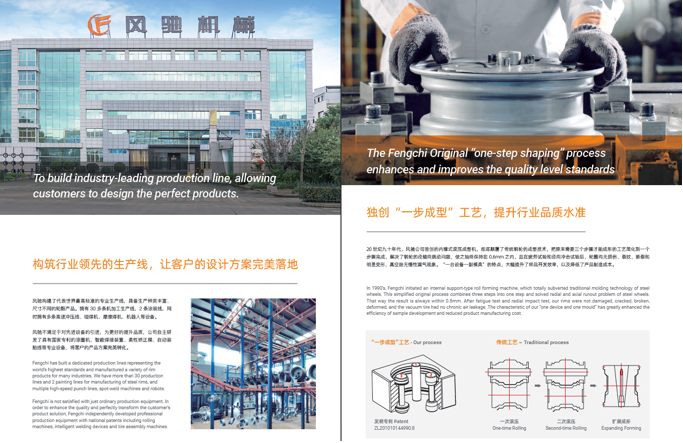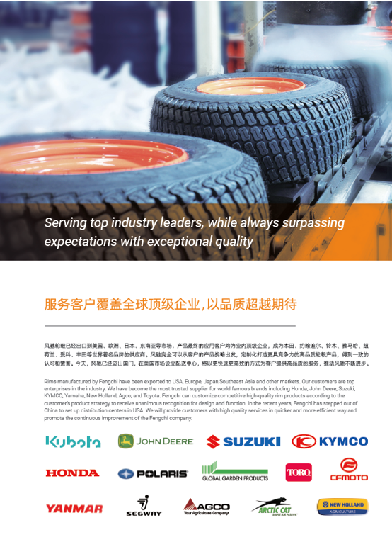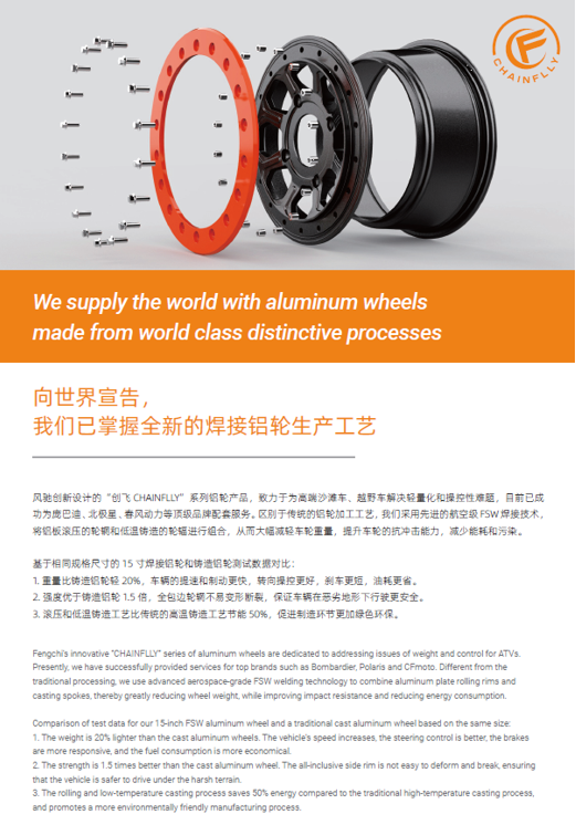 浙江風馳機械有限公司,成立于1994年,伴隨著時間的飛逝,一直以工匠精神專注生產非公路低速車輛輪轂,在董事長潘衛(wèi)民的英明帶領下,風馳以自信、沉穩(wěn)、堅實的腳步,企業(yè)逐步成為了世界500強合作伙伴、申請了企業(yè)獨有的輪輞品牌、創(chuàng)立了旗下5家子公司、獨創(chuàng)特殊工藝、產品革新換代,一直以實現“引領低速車輪發(fā)展,為中國制造正名”的使命及成為“全球知名低速車輛制造企業(yè)的最佳戰(zhàn)略合作伙伴”為愿景而一直努力著。