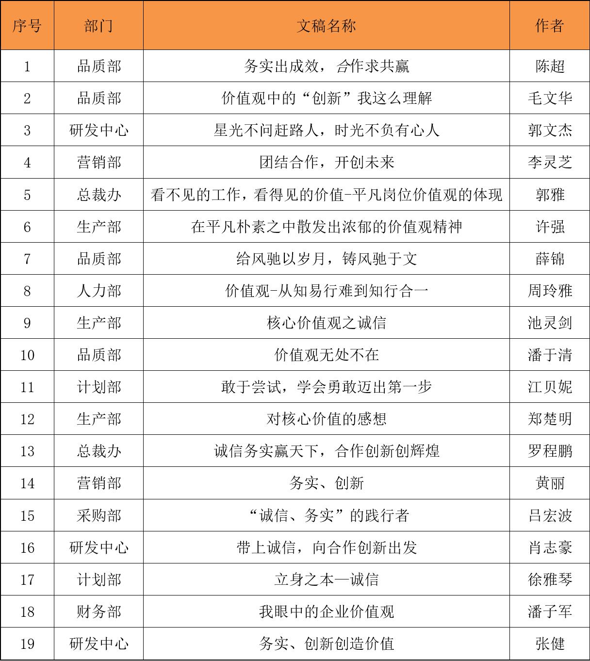 為弘揚(yáng)公司核心價(jià)值觀,使員工能更深刻理解“誠(chéng)信、務(wù)實(shí)、合作、創(chuàng)新”精神,公司每年組織開展一次“企業(yè)核心價(jià)值觀”征文比賽活動(dòng),2021年度征文比賽活動(dòng)評(píng)比已于8月7號(hào)圓滿結(jié)束。本次活動(dòng)收到來自公司人力資源部、總裁辦、采購(gòu)部、品質(zhì)部、財(cái)務(wù)部、生產(chǎn)部、計(jì)劃部、銷售部和研發(fā)中心總計(jì)19篇文稿。大家以“核心價(jià)值觀”為主題,立足本部門從實(shí)際出發(fā),擺出鮮活的案例,充分展現(xiàn)了對(duì)公司價(jià)值觀的理解和感悟。